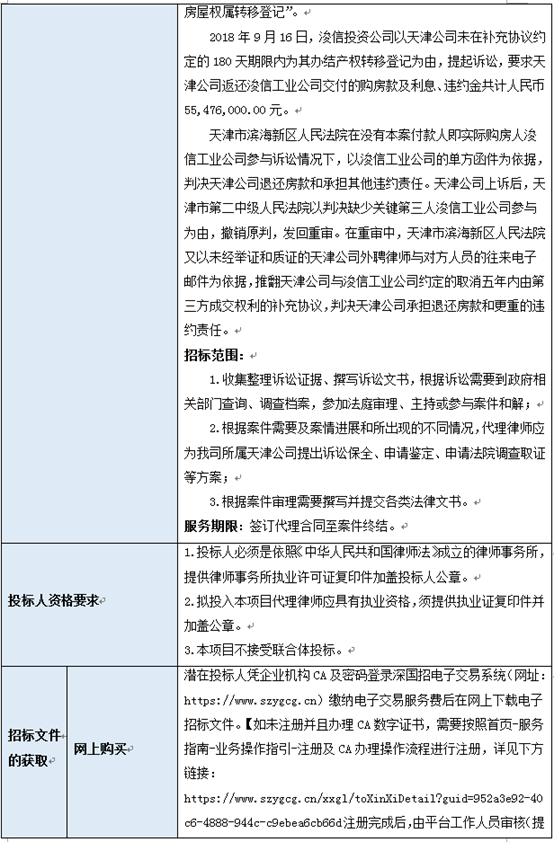 浚信投资公司购房合同纠纷诉讼二审代理律师服务项目(项目名称)招标人为深圳市必一运动(集团)有限公司(招标人单位名称),采购资金来自企业自筹(资金来源),项目出资比例为100%。项目已具备招标条件,现进行国内公开招标。