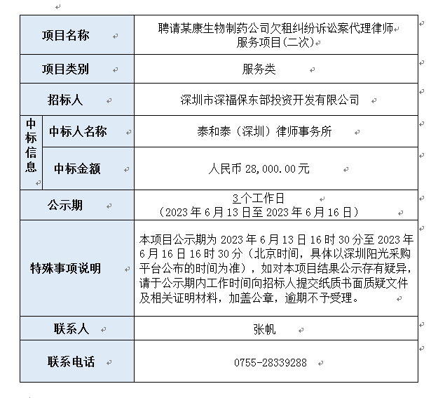 聘请某康生物制药公司欠租纠纷诉讼案代理律师服务项目(二次)中标结果公示