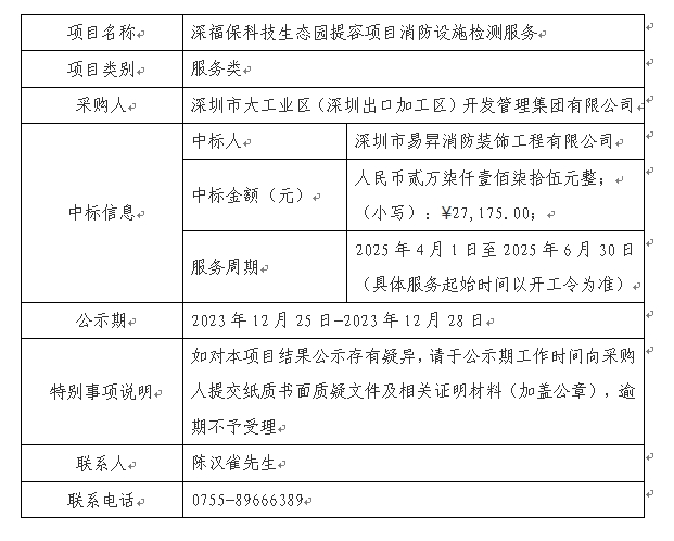 在深圳阳光采购平台进行公开招标的必一运动科技生态园提容项目消防设施检测服务已完成评审及定标,现将本项目评审的相关情况及中标结果进行公示,具体内容如下: