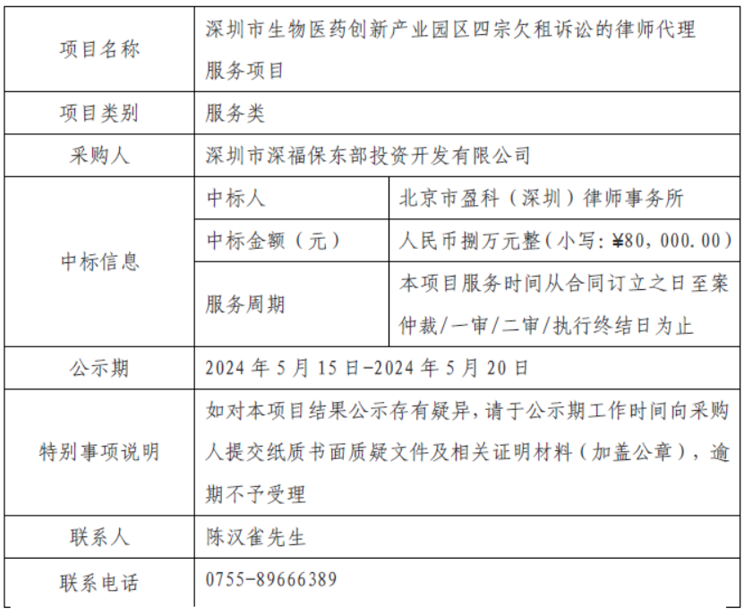 深圳市生物医药创新产业园区四宗欠租诉讼的律师代理服务项目中标结果公示