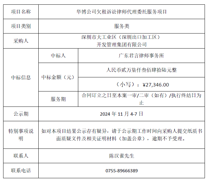 在深圳市阳光采购平台进行公开招标的华博公司欠租诉讼律师代理委托服务项目(项目编号:241BA0269430)已完成定标,现将本项目定标结果进行公示如下:
