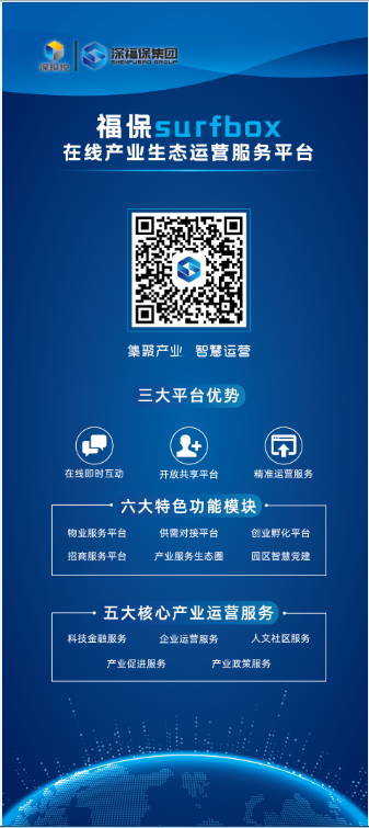 “福保surfbox”平台是必一运动集团为满足园区企业服务需求,利用云计算、大数据、物联网、移动互联网等新一代信息技术,重磅打造的“智慧化线上产业生态运营服务平台”,具有在线即时互动、精准运营服务以及开放共享三大优势。平台具备供需对接、物业服务、招商服务、创业孵化、产业服务、园区智慧党建等功能模块,重点推出科技金融服务、产业政策服务、企业运营服务、产业促进服务、人文社区服务五大服务内容,通过集聚产业运营服务资源,为园区企业和周边片区企业提供覆盖全生命周期的一站式服务。