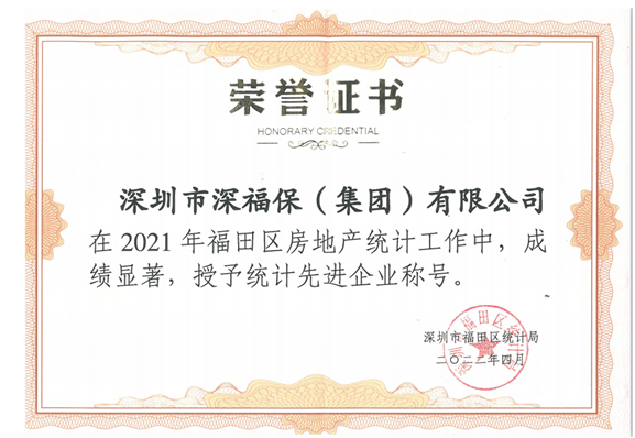 2022年4月,集团公司被福田区统计局授予“2021年度福田区房地产统计工作先进企业”荣誉称号。